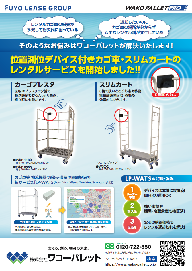 「LP-WATS」 は、カゴ車やスリムカートなどの物流機器に装着することで、機器の位置情報を把握・管理できるIoTサービスです。